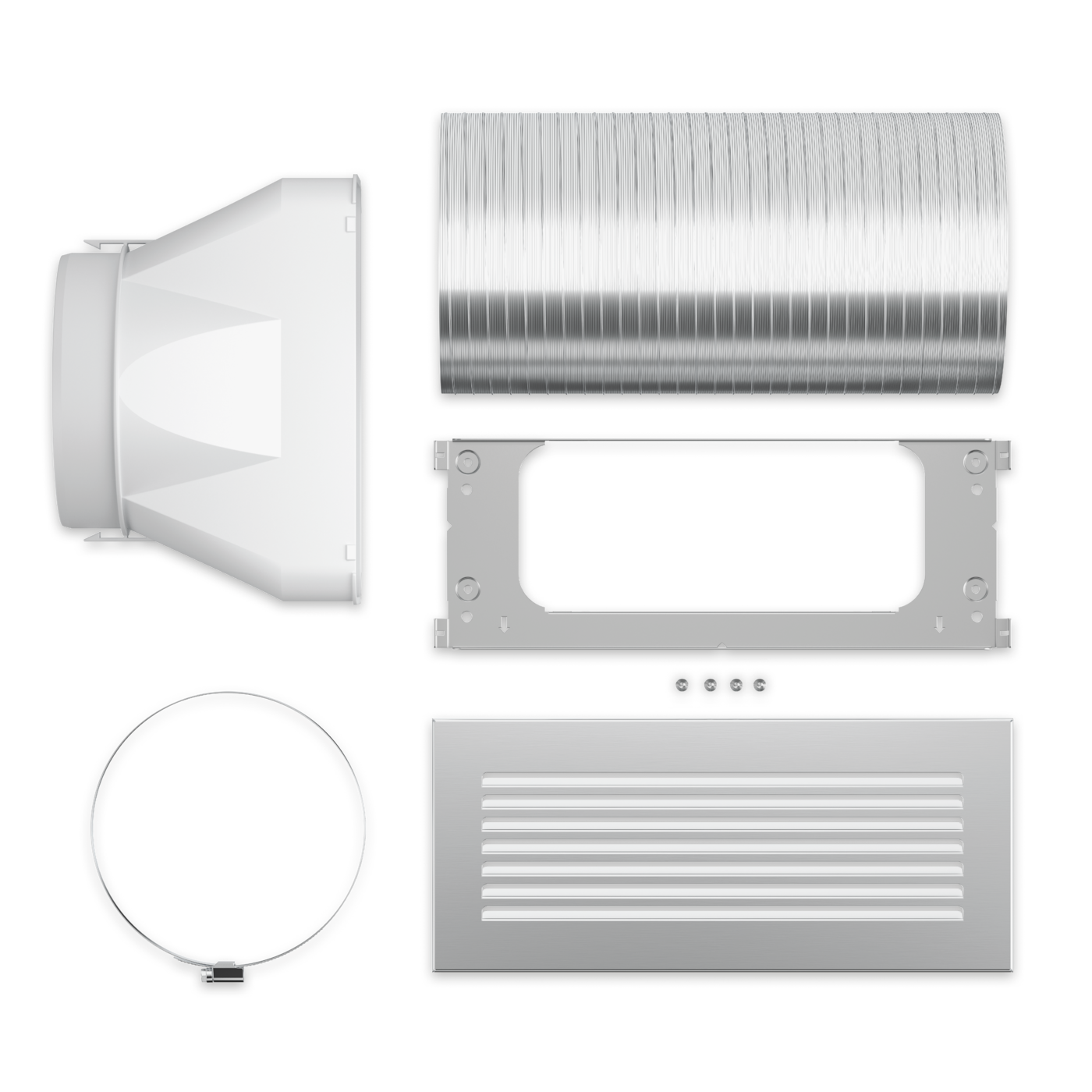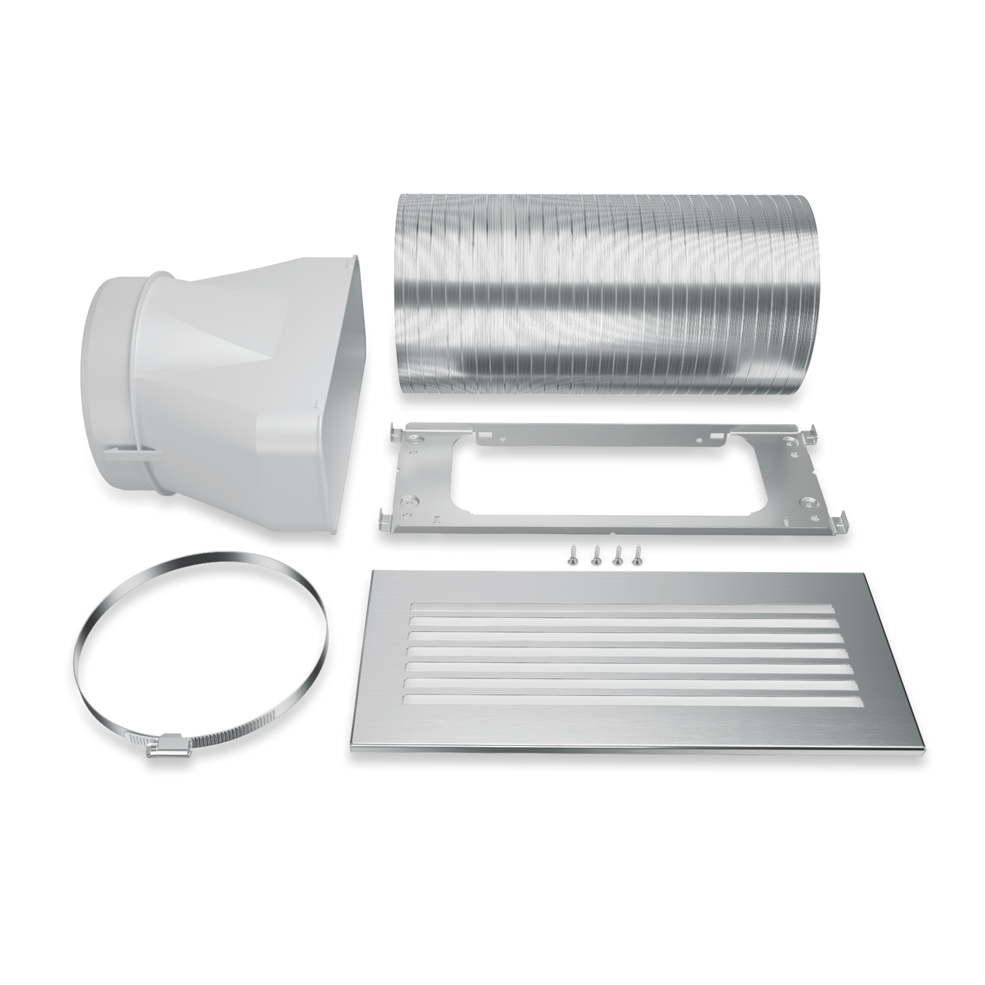 - Supplied as standard: Stainless steel exhaust grille, hose clip